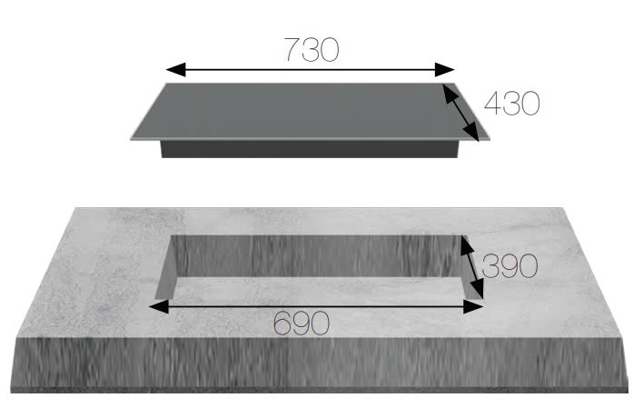 • Kích thước khoét đá: 690x390 mm