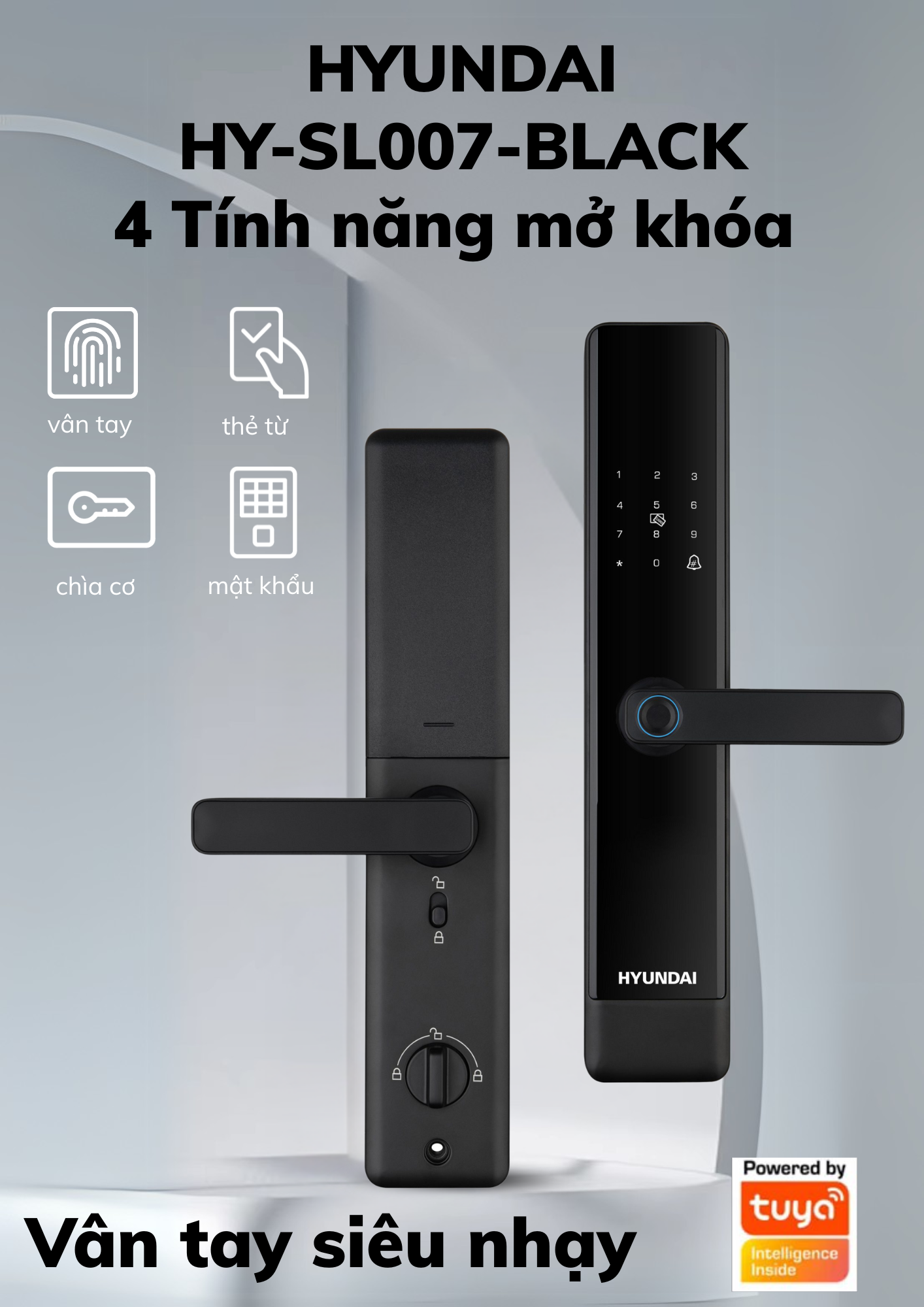 | Công nghệ mở khóa | Vân tay FPC Thụy Điển, mã số, thẻ từ, chìa cơ chống sao chép, App Tuya (Wifi) |