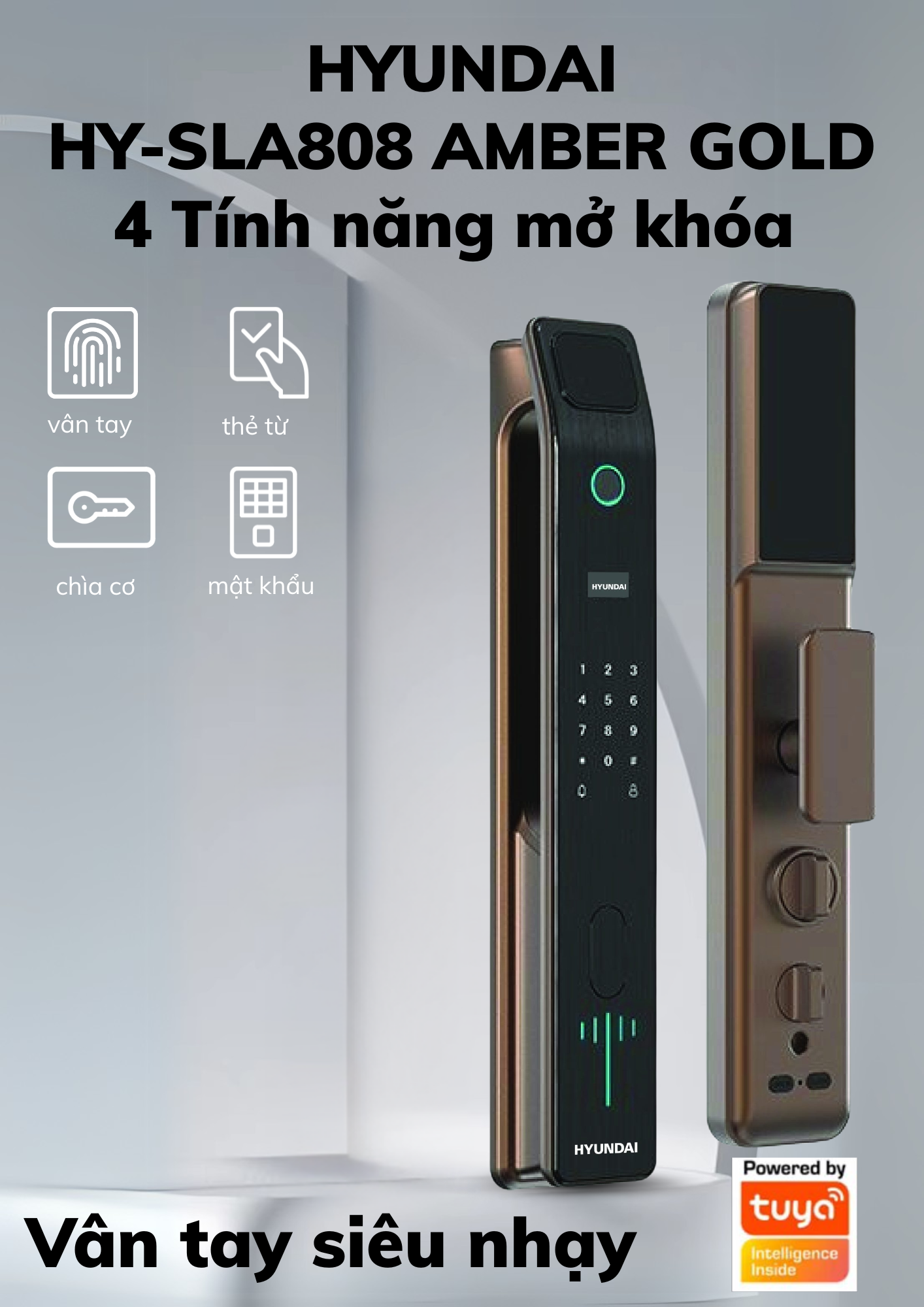 Khóa Hyundai HY-SLA808 Amber Gold: An toàn tối ưu, Mở cửa dễ dàng, Sang trọng vượt thời gian. Bảo vệ ngôi nhà bạn với công nghệ khóa điện tử tiên tiến và thiết kế Vàng Hổ Phách đẳng cấp.