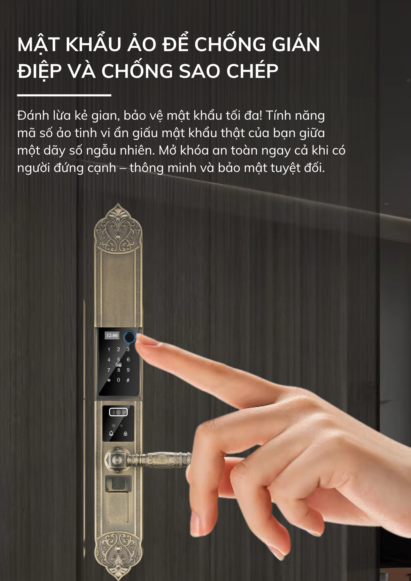 | Tính năng bảo mật | Cảnh báo mở khóa trái phép, cảnh báo đột nhập, vô hiệu hóa thẻ từ khi bị mất, mật khẩu ảo 32 ký tự |