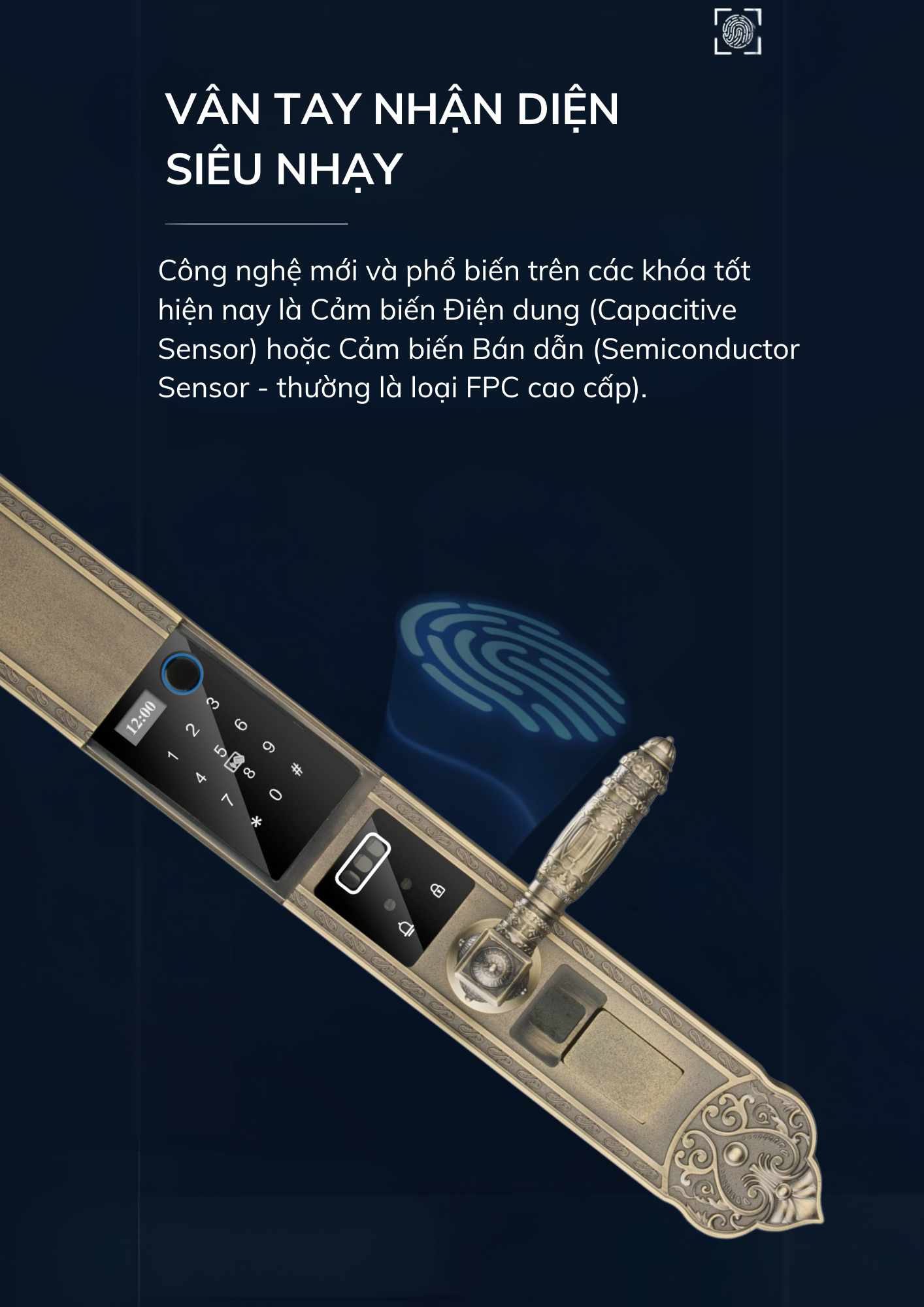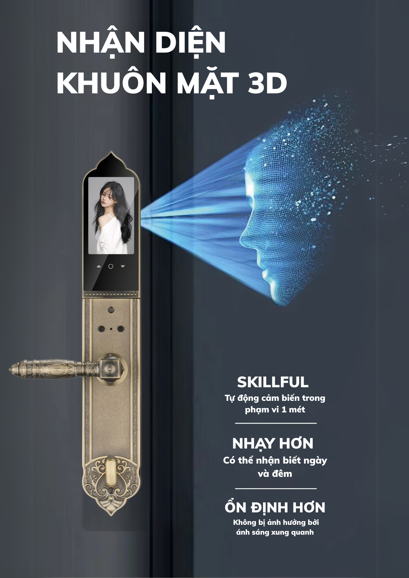 | Công nghệ mở khóa | Nhận diện khuôn mặt 3D, vân tay FPC Thụy Điển, mã số, thẻ từ, chìa cơ chống sao chép, App Tuya (Wifi) |