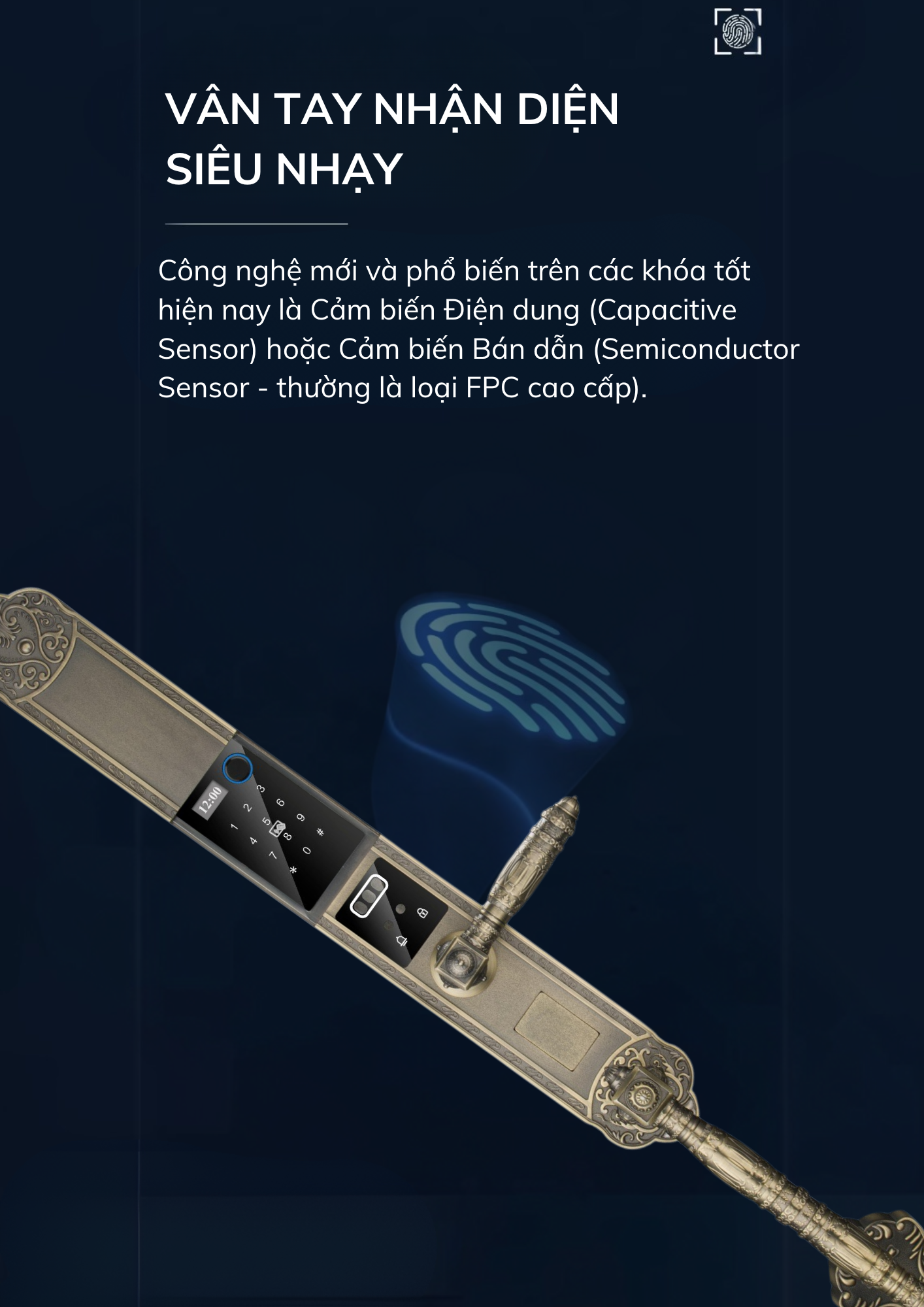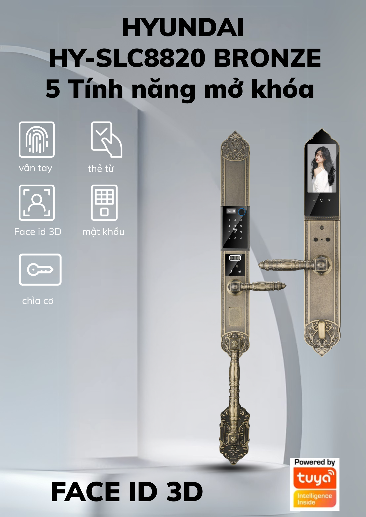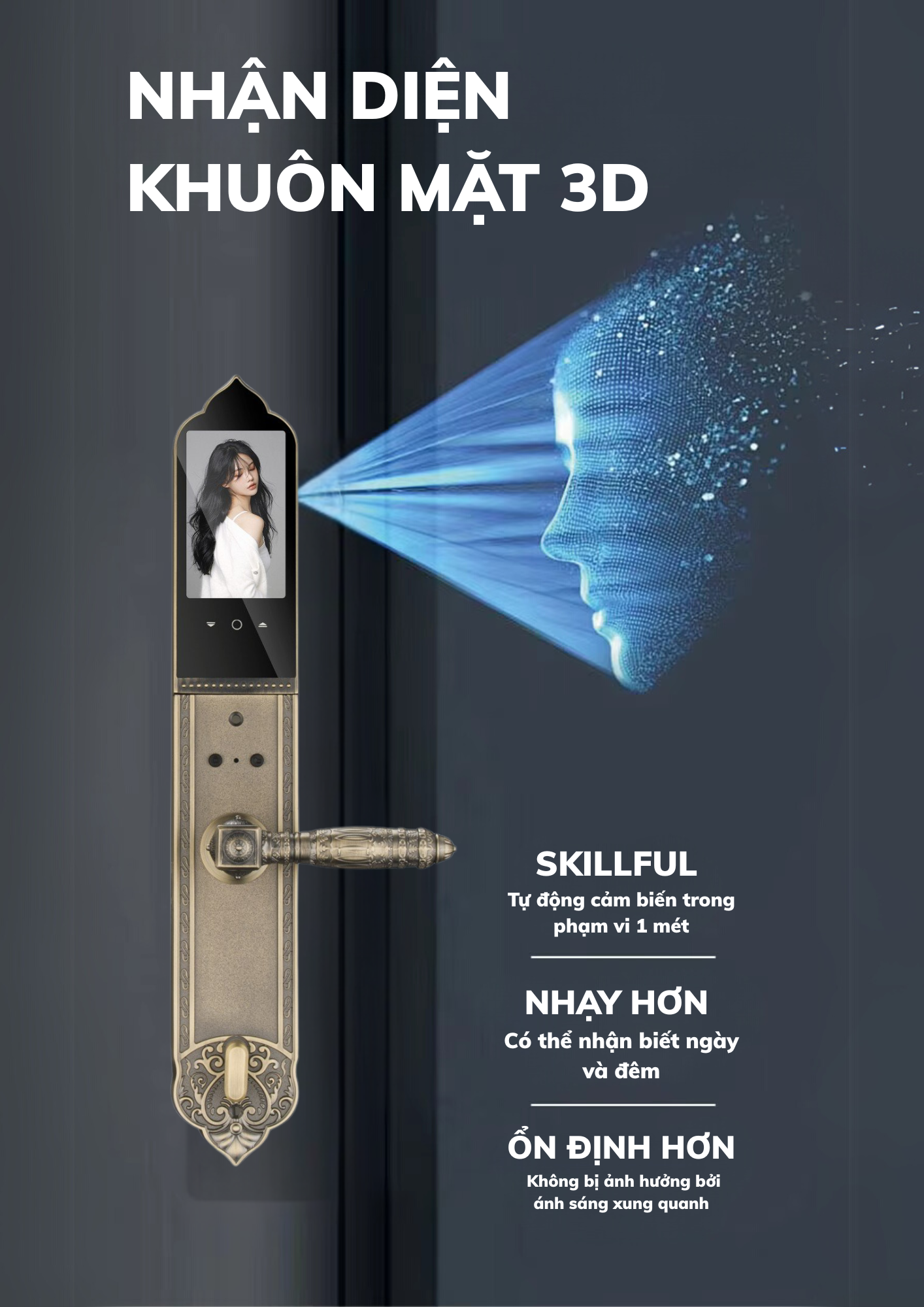 | Công nghệ mở khóa | Nhận diện khuôn mặt 3D, vân tay FPC Thụy Điển, mã số, thẻ từ, chìa cơ chống sao chép, App Tuya (Wifi) |