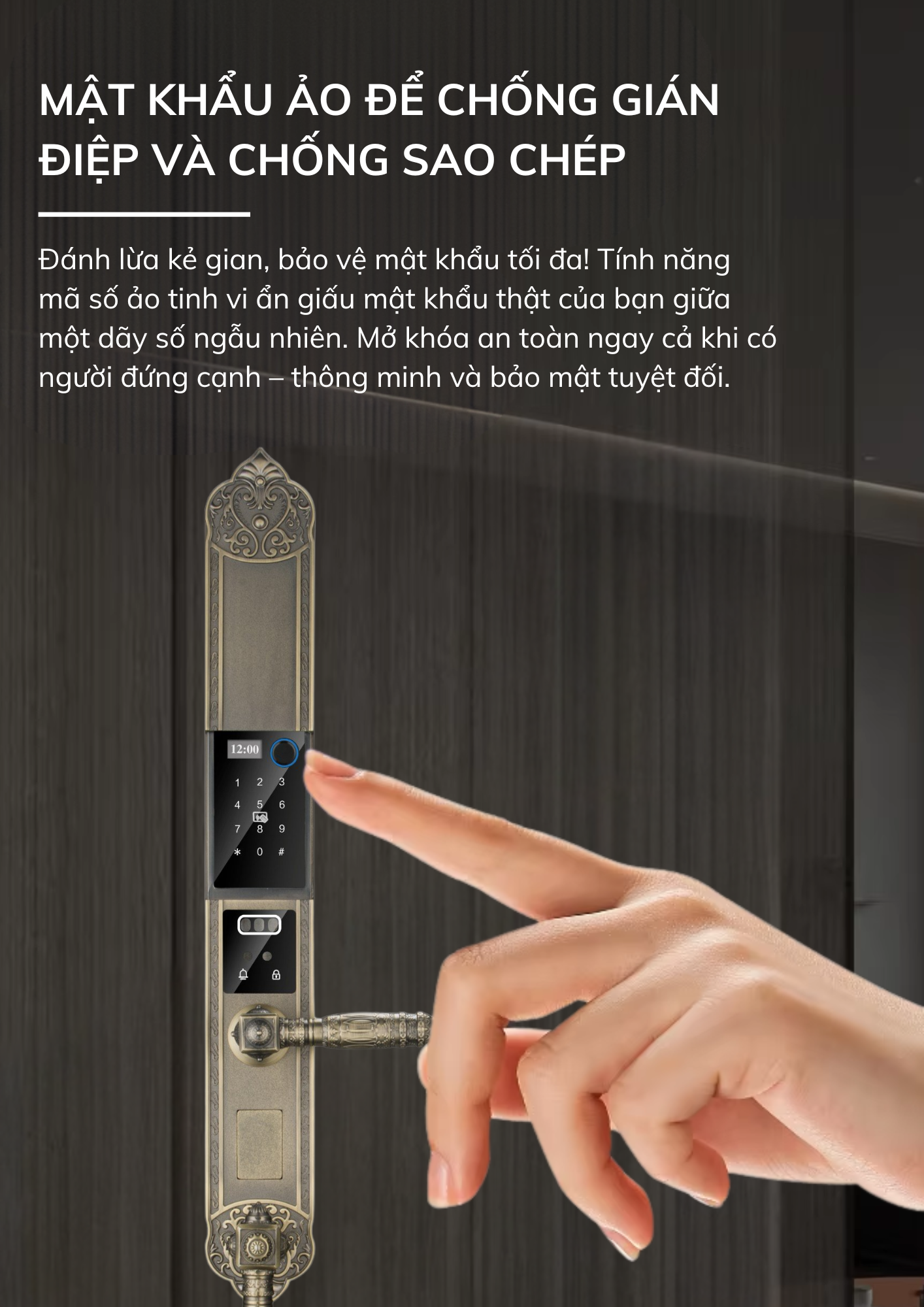 | Tính năng bảo mật | Cảnh báo mở khóa trái phép, cảnh báo đột nhập, vô hiệu hóa thẻ từ khi bị mất, mật khẩu ảo 32 ký tự |