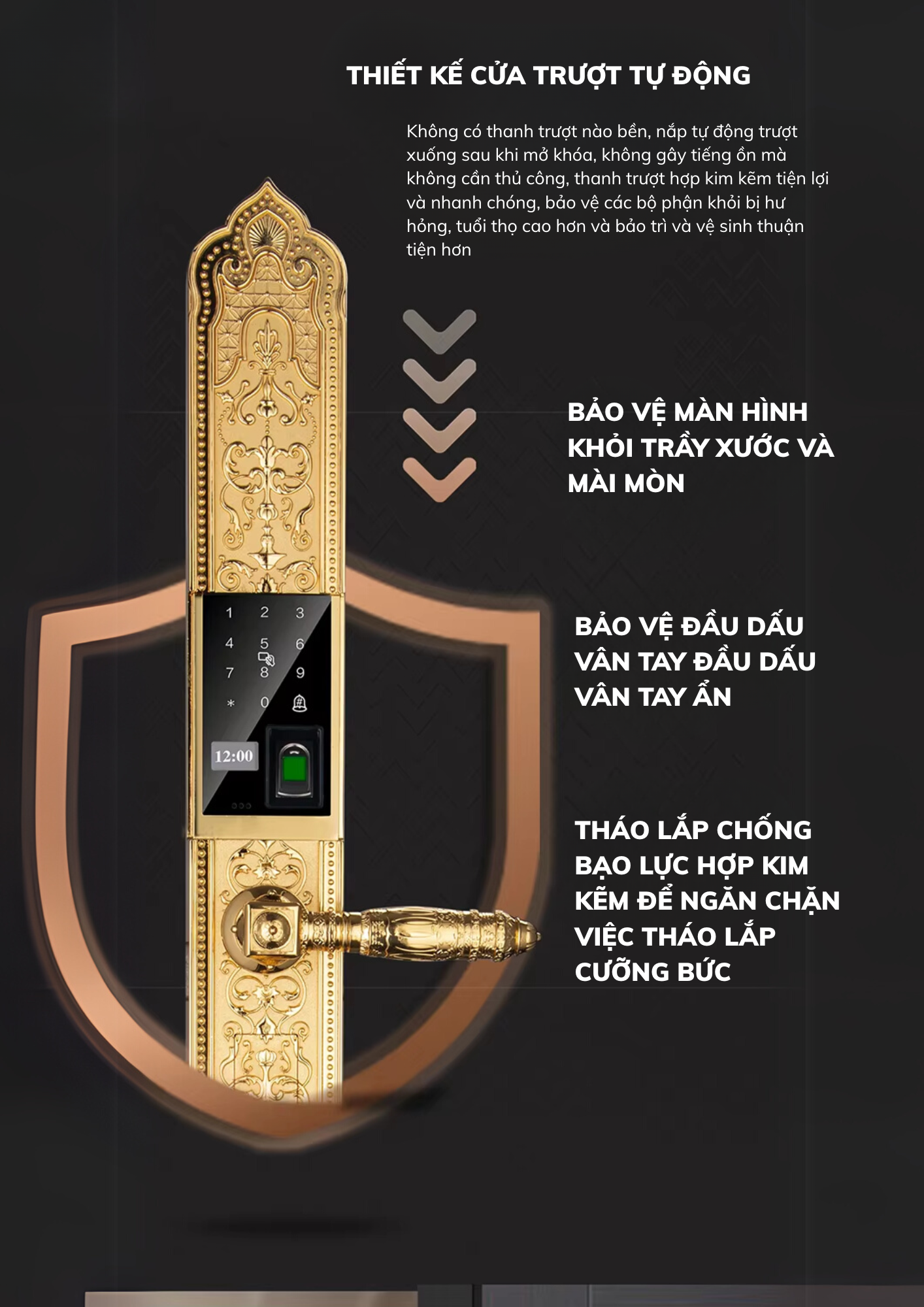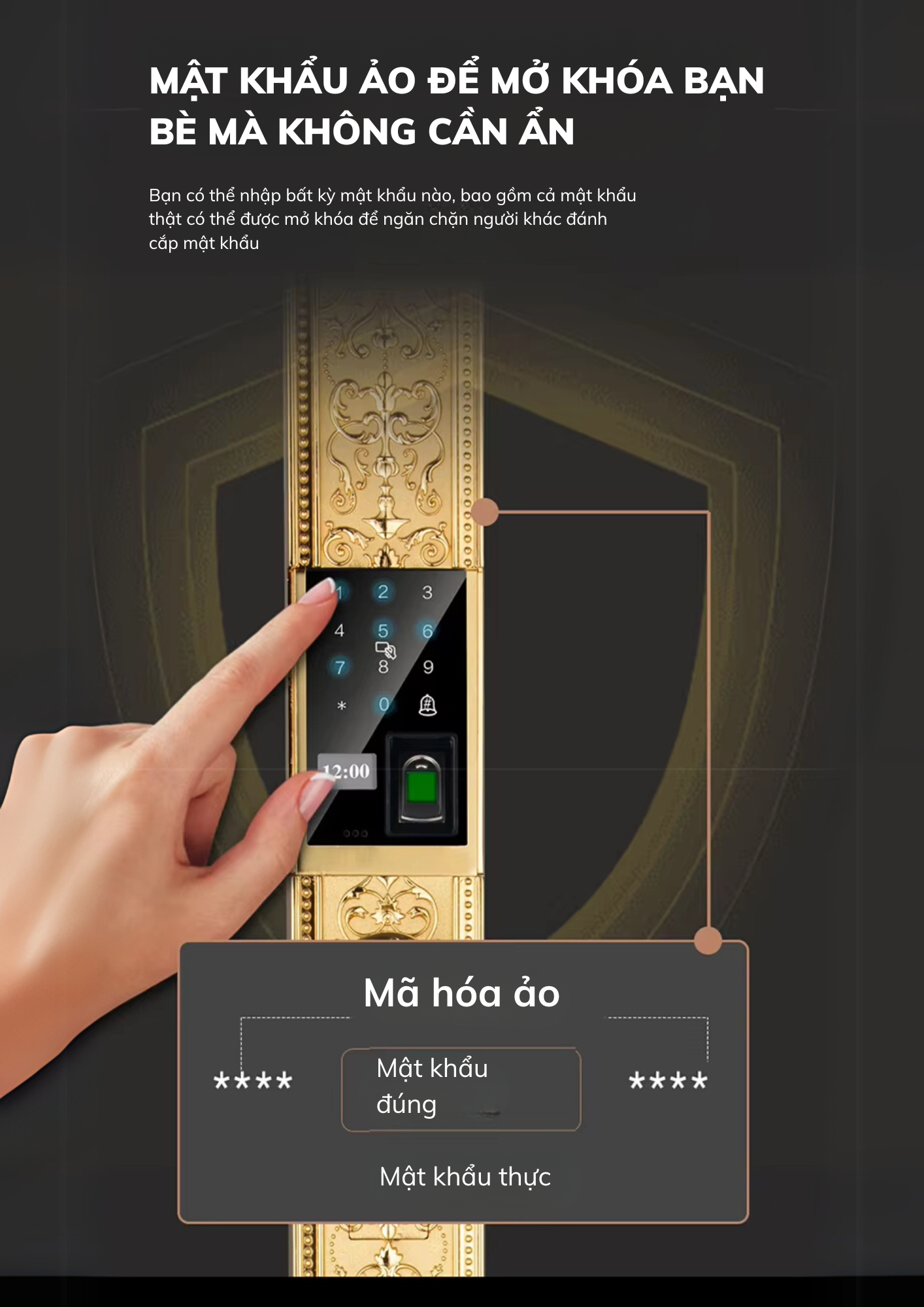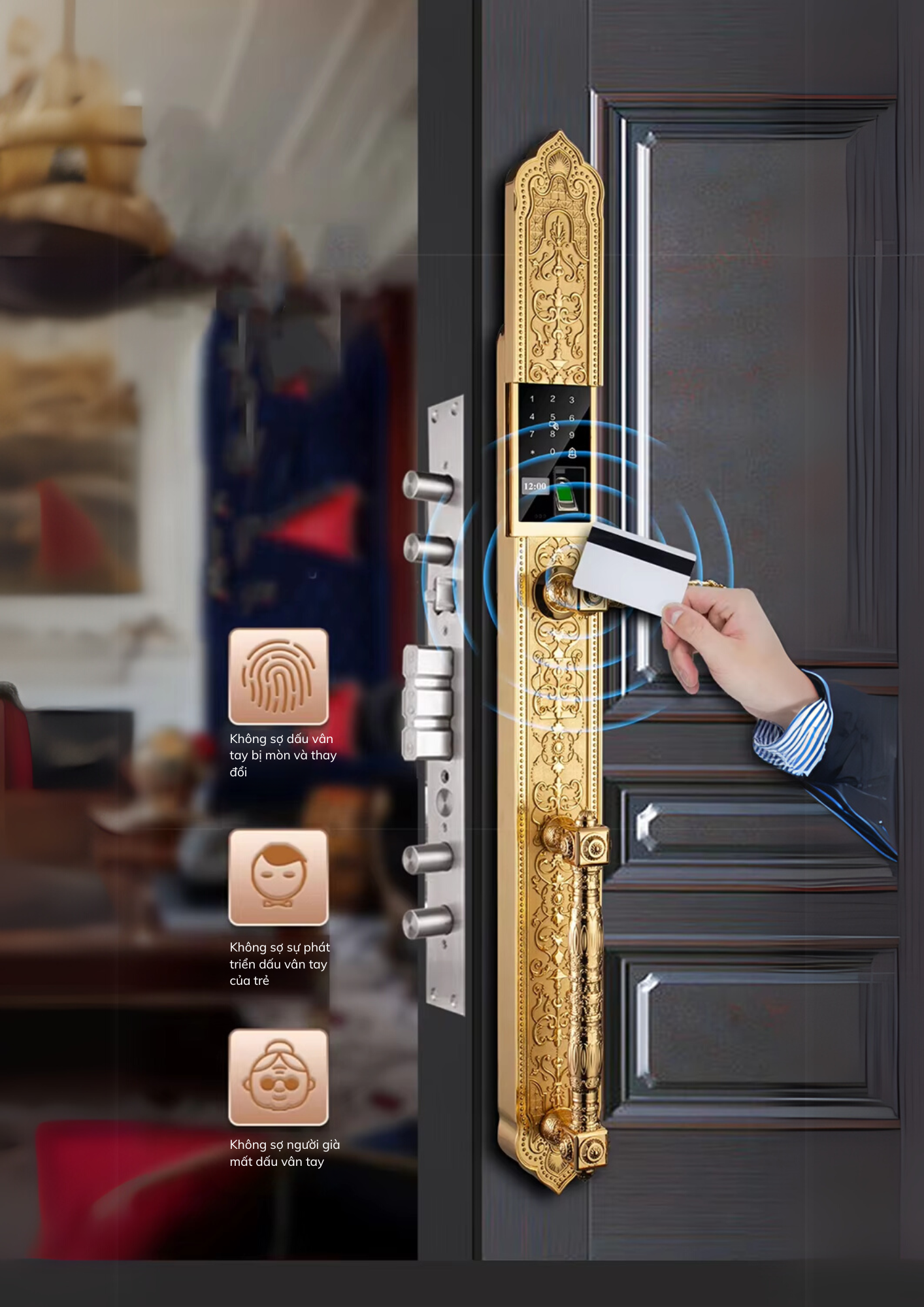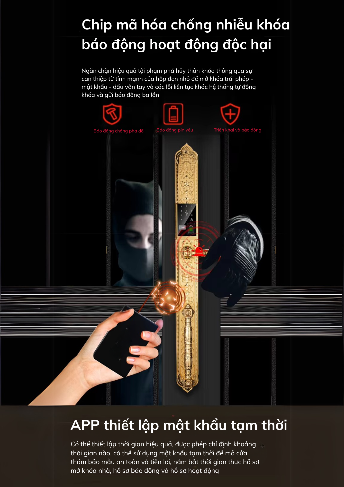 | Tính năng bảo mật | Cảnh báo mở khóa trái phép, cảnh báo đột nhập, vô hiệu hóa thẻ từ khi bị mất, mật khẩu ảo 32 ký tự |